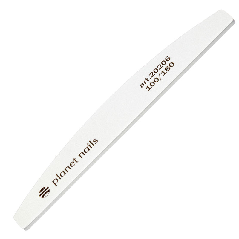 Широкая полукруглая белая пилочка для ногтей от Planet Nails - отличный инструмент для наращивания и коррекции искусственных ногтей. Абразивность 100/180 гритт.